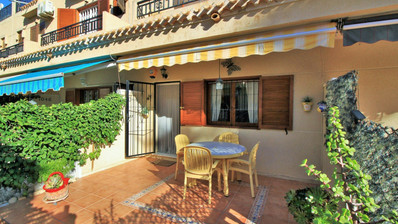 The property offers a great front tiled garden with retractable awnings, a bright lounge-dining area with feature fireplace, fully equipped kitchen to the rear, plus a downstairs bathroom with walk-in shower. There is also a storage cupboard located underneath the stairs. Upstairs there are 2 bedrooms with fitted wardrobes, and a family bathroom with walk-in shower. The twin bedroom has access to a small utility area, where you will find the washing machine and electric boiler. From the master bedroom you can access the South facing balcony. Sold with furniture, white goods, air-conditioning and underfloor heating.