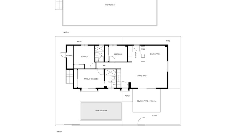 The house boasts 90 m² of living space on a 230 m² plot, offering a perfect balance between interior comfort and outdoor areas to fully enjoy the Mediterranean climate. It features three bedrooms and two bathrooms, with the master suite featuring a private bathroom and a large window overlooking the pool area, allowing for fantastic natural light throughout much of the day.