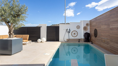 The property features a bright open-plan living and dining area connected to a fully equipped modern kitchen. Large windows provide abundant natural light and direct access to the terrace and private heated swimming pool with heat pump.