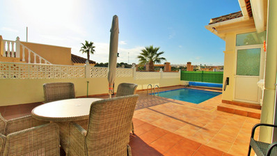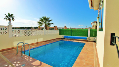 Additional features include new air-conditioning units, new PVC double-glazed tilt-and-turn windows with blinds, mosquito screens, and the villa is sold partly furnished. The property forms part of a well-kept community and also enjoys access to a large communal swimming pool located nearby.